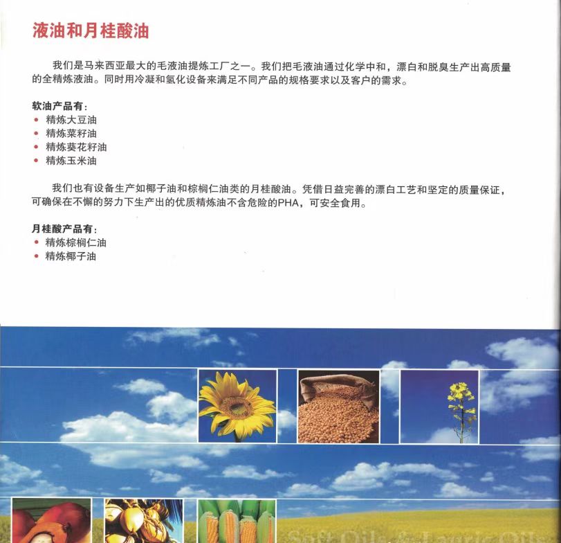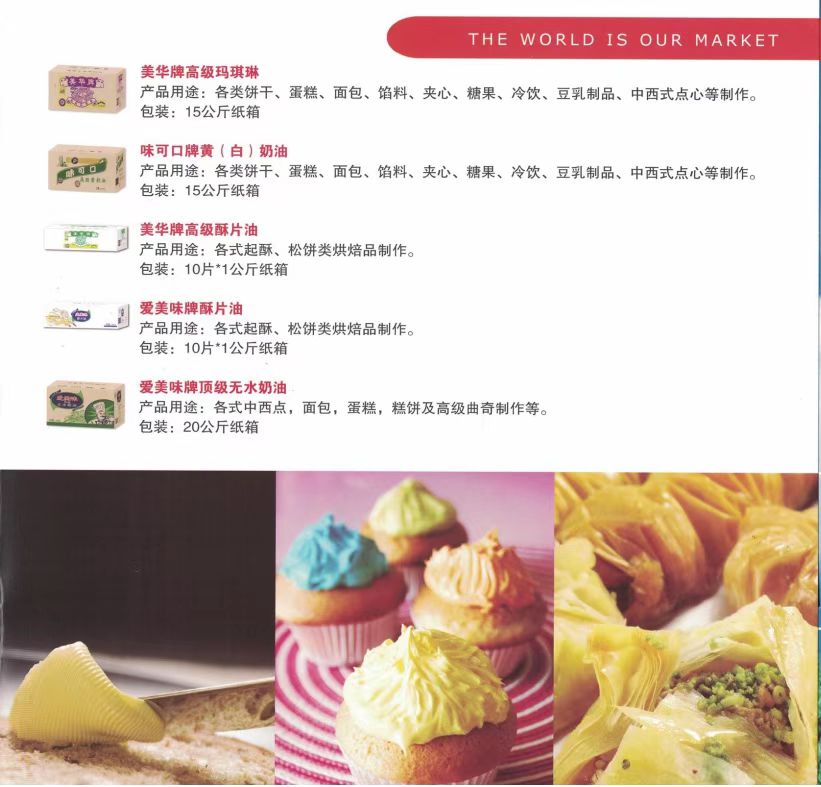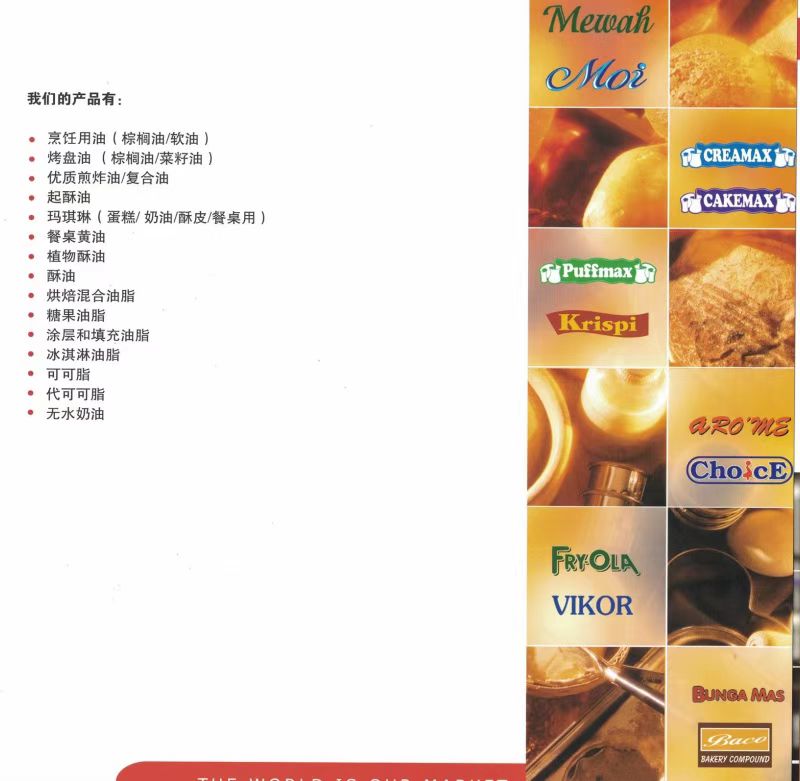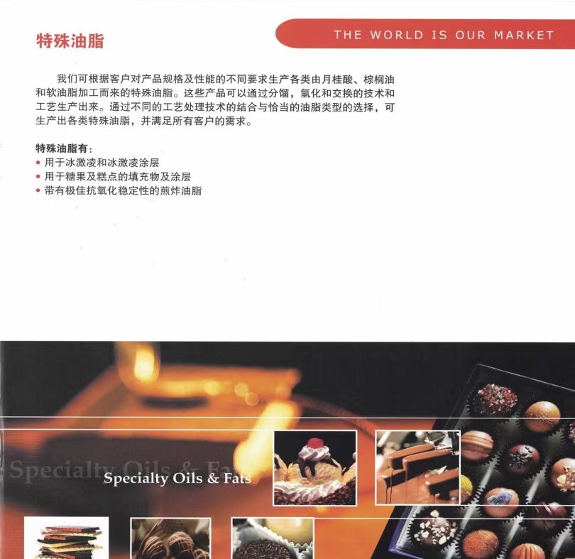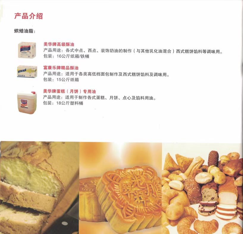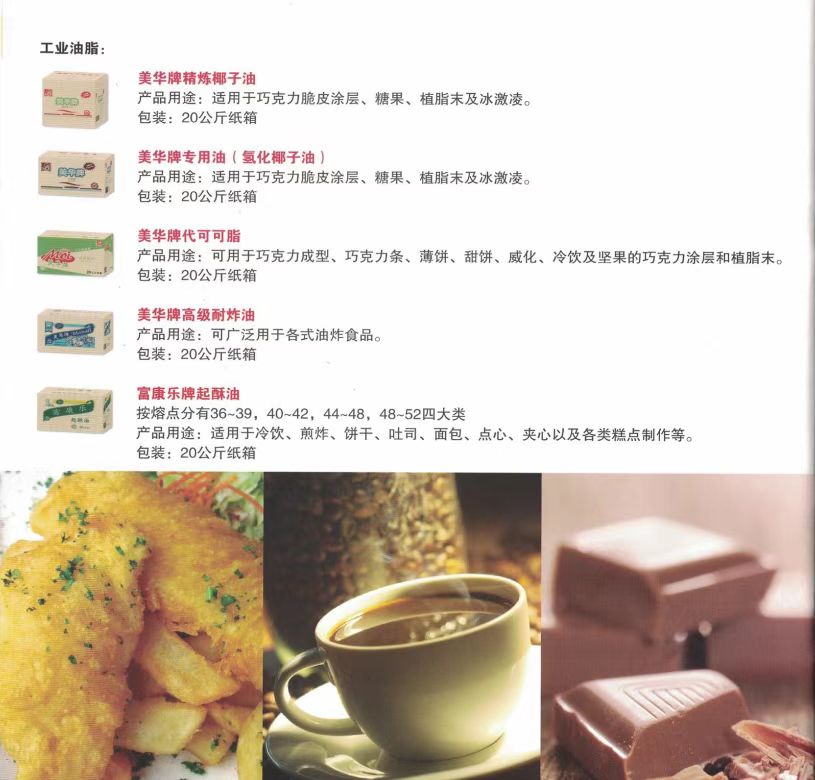 公司经营“特畅”"富康乐”"美华"无水酥油和起酥油等产品,是用优质精炼棕榈油经过二次干法分提不加入任何氢化溶剂,膜过滤提炼生产的。具有洁白﹑无味、含水量极少、油性好等特点。特别适合用于巧克力涂层,和面用油,夹心用油,馅料用油,加工糕点、面包、巧克力、饼干、酥饼;制作各类馅料、冷饮及煎炸食品,并可节省10-20%的生产成本。